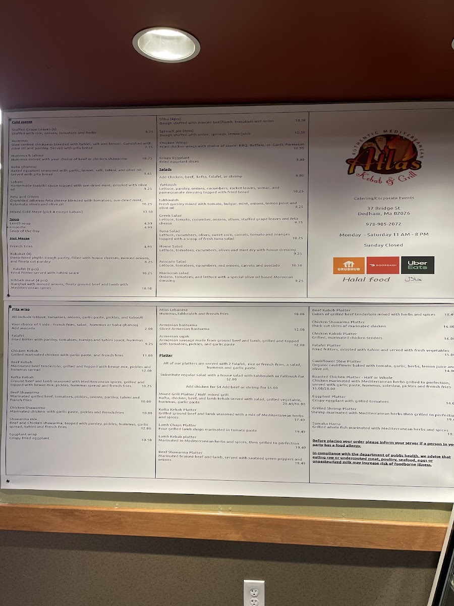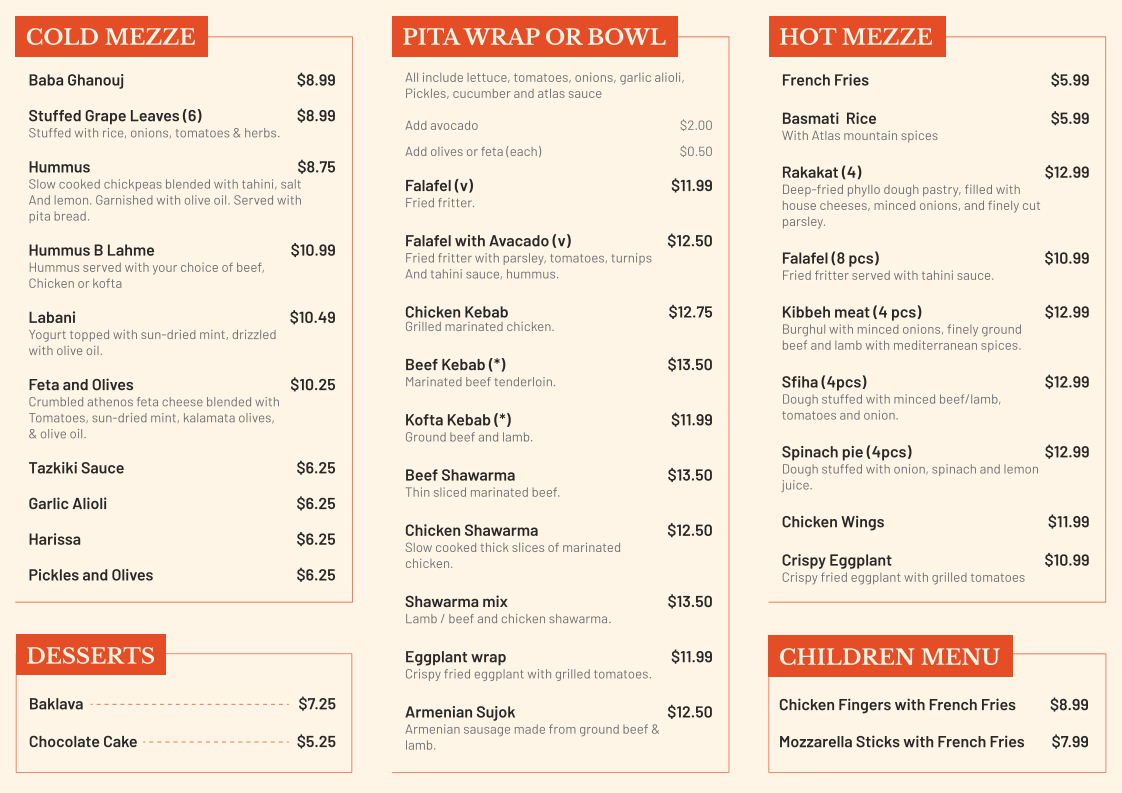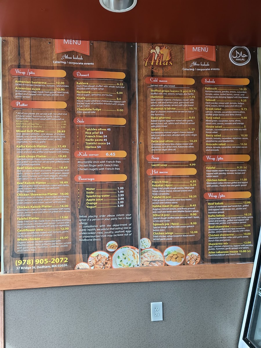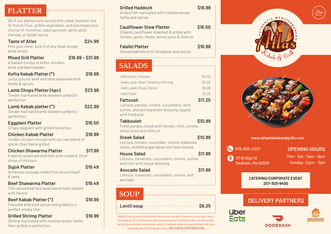 The menu at Atlas Kebab And Grill feels thoughtfully curated, focusing on a balance of hearty grilled plates and comforting Mediterranean staples that reflect consistency and care rather than unnecessary excess. The Chicken Kabob Platter stands out as a core offering, showcasing well-seasoned, grilled chicken that anchors the menu with a filling and reliable main option, ideal for diners looking for a complete meal. Supporting flavors like the Side of Taziki Sauce add freshness and creaminess, enhancing both grilled meats and sandwiches without overpowering them. For those interested in bolder, spiced profiles, the Moroccan Sausage brings depth and warmth, highlighting the kitchen’s ability to handle robust seasoning while keeping the dish approachable. Meanwhile, the Falafel Sandwich rounds out the menu as a satisfying vegetarian choice, offering crisp texture and familiar Middle Eastern flavors in a convenient format. Overall, the menu emphasizes straightforward execution, recognizable dishes, and complementary sides, making it easy for guests to navigate and enjoy without distraction, while still delivering variety through different proteins, textures, and flavor profiles.