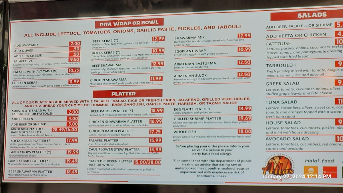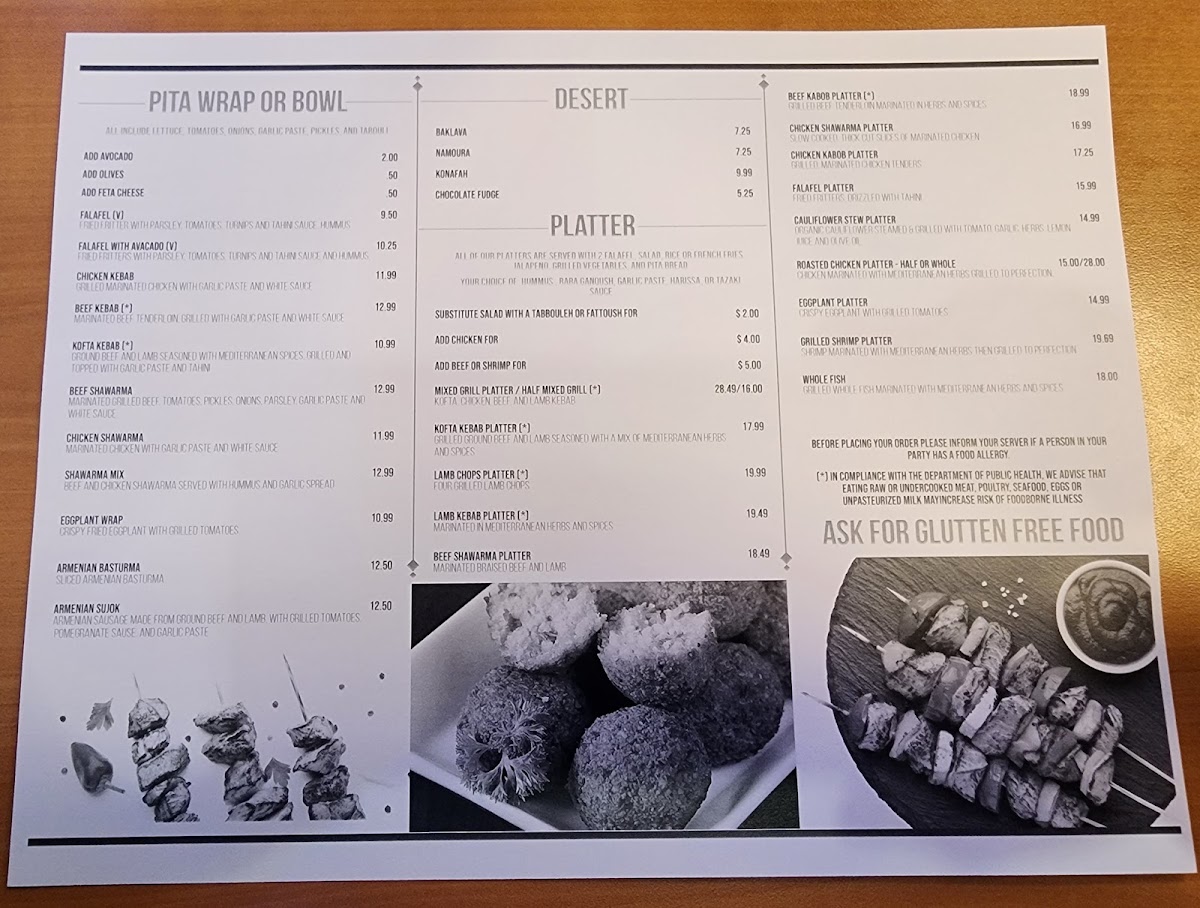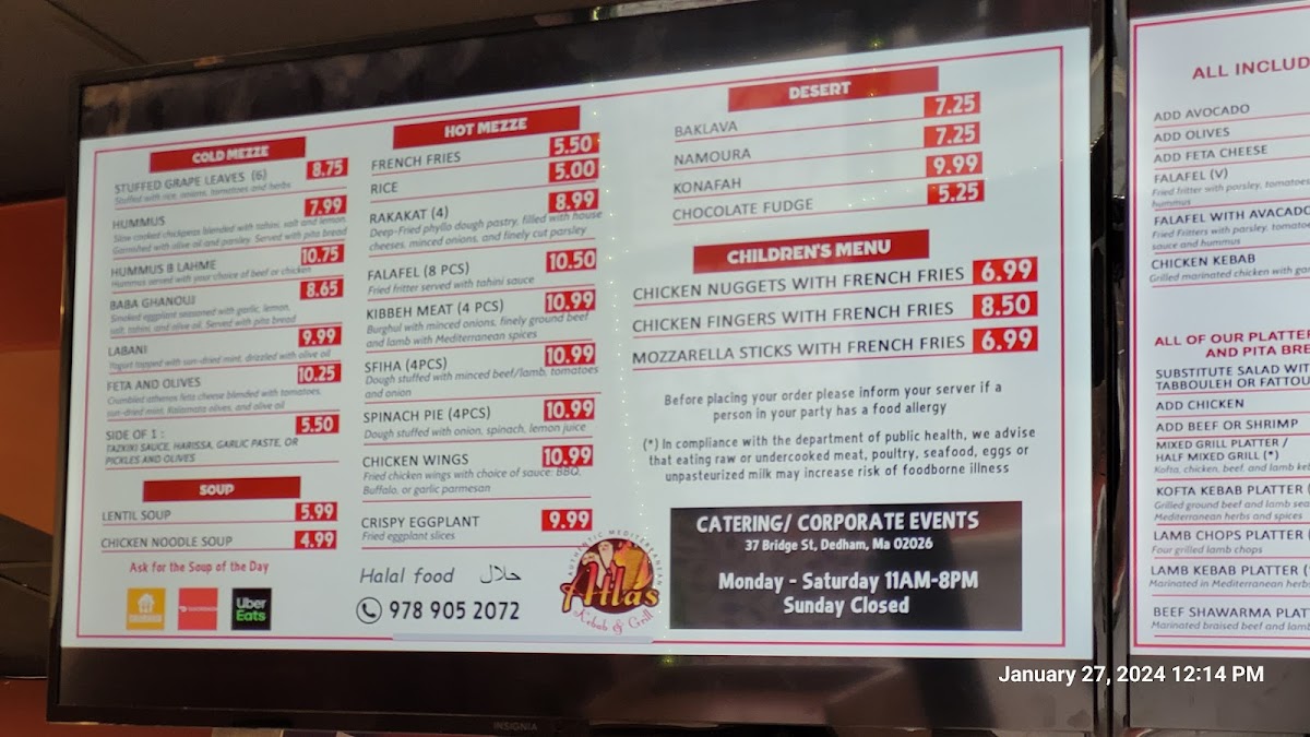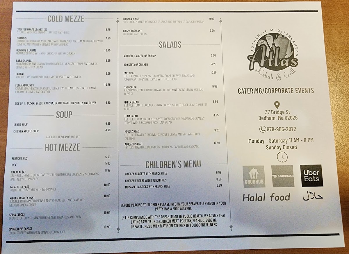 The menu at Atlas Kebab And Grill feels thoughtfully curated, focusing on a balance of hearty grilled plates and comforting Mediterranean staples that reflect consistency and care rather than unnecessary excess. The Chicken Kabob Platter stands out as a core offering, showcasing well-seasoned, grilled chicken that anchors the menu with a filling and reliable main option, ideal for diners looking for a complete meal. Supporting flavors like the Side of Taziki Sauce add freshness and creaminess, enhancing both grilled meats and sandwiches without overpowering them. For those interested in bolder, spiced profiles, the Moroccan Sausage brings depth and warmth, highlighting the kitchen’s ability to handle robust seasoning while keeping the dish approachable. Meanwhile, the Falafel Sandwich rounds out the menu as a satisfying vegetarian choice, offering crisp texture and familiar Middle Eastern flavors in a convenient format. Overall, the menu emphasizes straightforward execution, recognizable dishes, and complementary sides, making it easy for guests to navigate and enjoy without distraction, while still delivering variety through different proteins, textures, and flavor profiles.